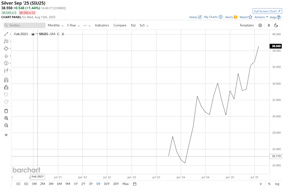 Near-term technicals remain firmly overall bullish for both gold and silver markets. Price action recently has been sideways and choppy for both metals, but at still historically elevated levels. Longer-term charts show gold and silver still in solid price uptrends, dating back to 2016 for gold and back to 2022 for silver.